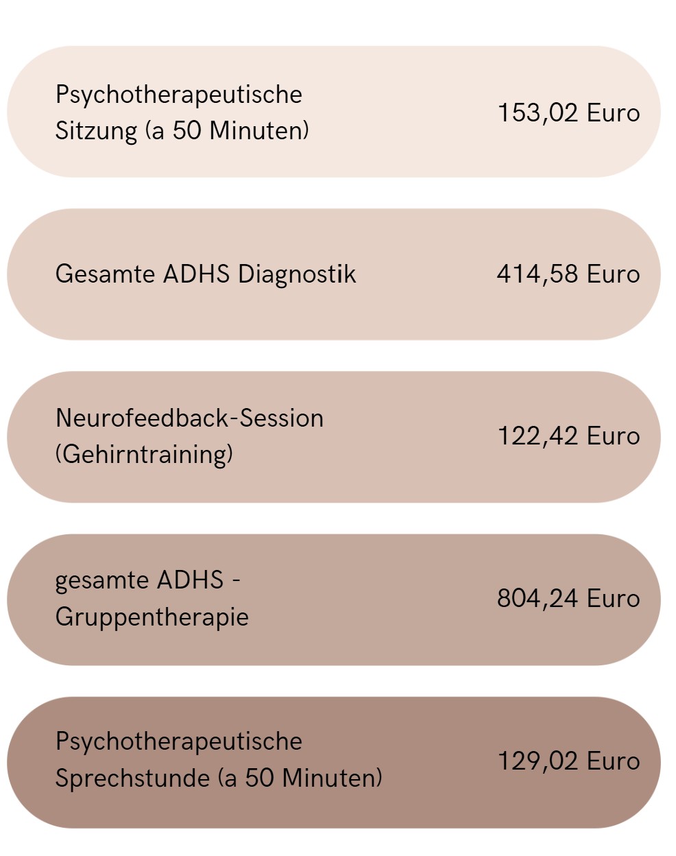 Demnach kostet eine Einzelgesprächsstunde in der Regel 153,02 Euro. Es können zusätzliche Kosten, z.B. für die Auswertung von Testdiagnostik und telefonische Konsultationen hinzukommen.